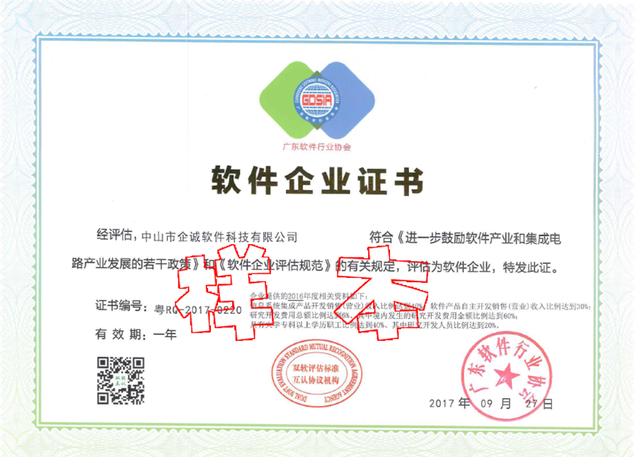 热烈庆祝 中山市企诚软件科技有限公司 通过广东省软件企业评估,享受国家对软件企业的相关扶持和照顾政策。